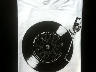 Record/Motorcycle Wheel design by Jeremy Hansen printed on white American Apparel Unisex t-shirts. Available in Small, Medium. Large and XL.